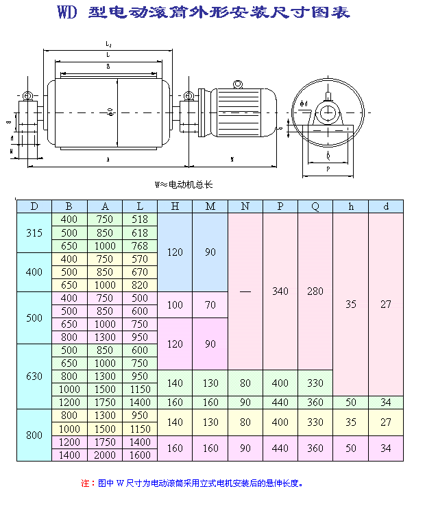 (1).因目前外裝式電動滾筒尚未制定相關(guān)行業(yè)標(biāo)準(zhǔn),本廠將該型號電動滾筒首位代號用W(“外裝”的首位漢語拼音)表示。外裝式電動滾筒外置電機可分為立式電機和臥式電機,用戶訂購時請加以說明;